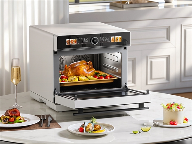 上烤下蒸,协同烹饪:得益于顶置星穹双风炉与底部大功率蒸汽直喷的硬核配置,X2实现了真正意义上的专业级上烤下蒸。传统烹饪需先后处理烤制与蒸菜,不仅耗时且难以同步上桌;而X2通过分舱协同技术,顶部星穹双风炉以720°热风循环负责烤制(如羊排、鸡翅),底部蒸汽系统同步直喷锁鲜(如蒸虾、蒸鱼),实现一炉同出、效率翻倍。相比其他宣称“上烤下蒸”却因无风炉配置导致烘烤不均,或因分舱设计不佳导致串味的竞品,X2真正做到了烤色均匀、蒸食鲜嫩、味道不串。无论是家庭聚餐需要蒸烤一体机快速出餐,还是日常想要烤鸡翅与蒸时蔬同步完成,X2都能将烹饪时间缩减50%,让中西美味同台亮相不再将就。