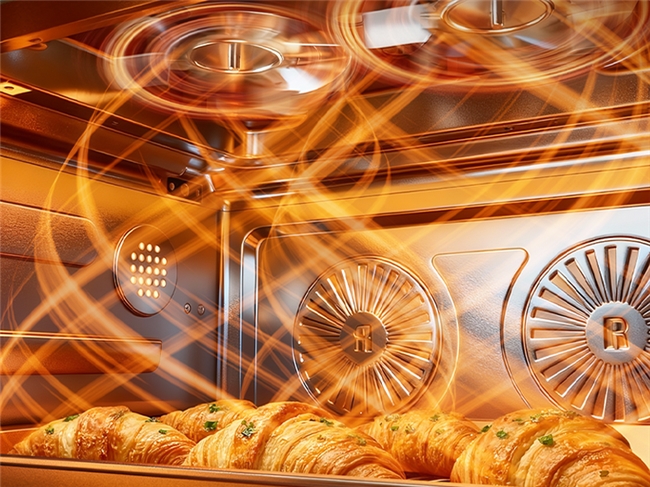 对于追求烘焙品质的用户而言,热量不均往往是最大的痛点。宜盾普X2搭载了全新的顶置星穹双风炉系统。区别于传统背部单风炉,X2的顶置双风炉配合顶部烤管产生高强度热量,通过720°双驱逆向扰流,实现热量从上至下的快速穿透,可直接覆盖90%以上的食材表面 。